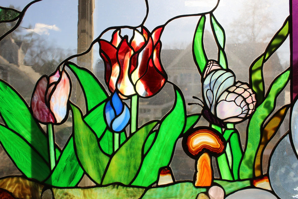 My present work consists of a variety of styles; from detailed floral pieces, landscapes, abstracts, L.C. Tiffany reproductions, to three-dimensional panels. The types of glass I use include new antique, mouth-blown, opalescent, confetti, streakies, heavy ripple and drapery glass to name a few. With the great variety of Tiffany reproduction glass now available you can find mottled glass, brilliant opalescent and confetti glass of many densities and color to suit any inspiration. With imported glass you can find French new antique, English streakies and German flashed glass (a fingernail thickness of colored glass fused onto one-eighth inch of clear or light color glass).